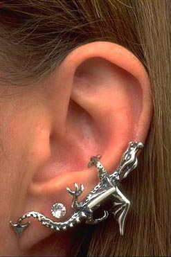 | Whispering Dragon - Not quite an ear cuff but still does not require any piercing. Created specially for the right ear, this adorable dragon whispers secrets into its wearers ear. No need for anything extra holes or any special ear shape - this is perfect for everyone as it hangs off the inside of your ear as shown. Of course, the diamond stud pictured is not included. Solid sterling silver. Also available in 14k gold |