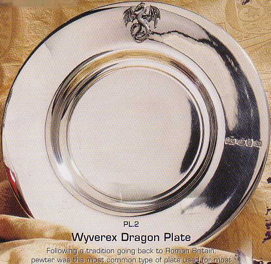 | PL2 - Wyverex Dragon Plate - Following a tradition going back to Roman Britain, pewter was the most common type of plate used for most of the later period up to the C.18th, when porcelain succeeded. Alchemy make a highly polished traditional C.17th style 11" (280mm) pewter dinner plate, with the added detailed motif of the legendary dragon. I love this plate and would eat every meal off it if I could. Perfect for medieval banquet or as a wedding gift - why not suggest this to the inlaws? |