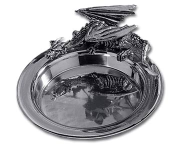 | DR603 - Dragonlore Dish - The classical dragon slinks around the edge in protection of his personal den. While this can be used as an offering dish, it can also be used for an incense holder by placing dragon sands or salt on the bottom to absorb the heat and a charcoal round on top of the dragon sands or salt. This can also be used as a candy dish (for chocolate of course!), a desk ornament for paper clips etc or whatever you choose! |