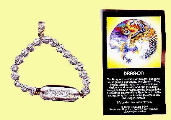 | Dragon Feng Shui Bracelet - The Dragon is a symbol of Strength, Goodness, Courage and Endurance. The Dragon is Yang energy which is male. He is the emblem of vigilance and security, and also the spirit of change. In Chinese mythology the Dragon is the predestined partner of the Phoenix, which is Yin energy. Feng Shui endeavors to capture Chi', the Dragons breath. This product has been blessed by Buddhist monks. |