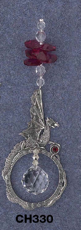 | Dragon Circle - A personal favourite. This is a dragon, wings above his body, perched on top of a circle within which dangles a 20mm crystal ball. His paw on a red crystal, this is a beautiful piece for the wondow. |