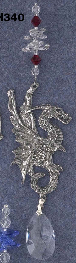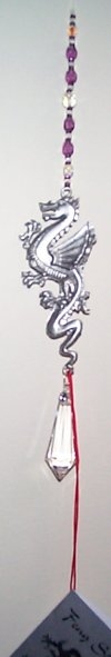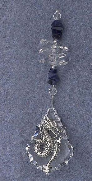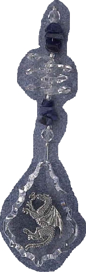 | Serpent Dragon Starburst - beautiful cascade of crystals to a large terminating crystal with a pewter serpent dragon on it. This really doesn't show up well in the picture but it is a great crystal hanger for those more interested in the more serpentine dragons. A beautiful way to create beautiful rainbows and a stunning visual in any window, for any dragon lover or follower of Feng Shui. Comes with descriptive card. |