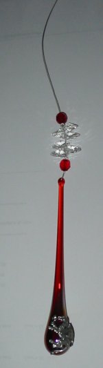 | CH124 Dragon Tears - The dragon is a fiery creature, confident, a risk taker, and adventurous. Dragons are associated with Strength, health, harmony and good luck. Placed in the home they banish evil spirits. These dragon tears are red or purple long tears of iridescent glass with a totemic pewter dragon on the bottom. On the top are 6 clear crystal baguas and 2 matching colour beads - purple for the spirit dragons and red for the fire dragons. These, as with all our crystals, have a wire with loop for hanging. |