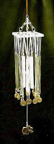 | Small Square Glass Windchimes with I Ching coins and Dragon on dangling middle bit. This magnificent set of wind chimes is perfect for right now. They can be moved to various places in your home as the 5 deadly yellow stars move (every Chinese New Year they move)Representing water and windchimes, this will help combat the 5 yellow and help your home or business prosper! |
