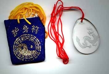 | Glass Dragon Pendant in Pouch. The dragon is a protective animal and one of the 4 celestial animals. If you activate the dragon, you will also activate the tiger but should never activate the tiger directly as its energy could turn against you. Either take this charm with you in its protective cloth pouch with an embroidered protective bagua on it. It has a descriptive card so you'll always know what it means and makes a great gift. |