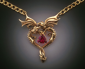 | Dragon Heart - This breathtaking Dragon Heart Pendant is pictured here in 14K gold with a 9 mm trillion Nigerian Rubelite Tourmaline. The two dragons entwine to form the shape of a heart and frame the stone. This piece is also lovely in sterling silver set with a 9mm trillion amethyst or blue topaz. Figero chain comes attached and dragons are detailed on both sides. Size: 1 3/4" W x 2" H This is a special order item and will be made after being ordered. Therefore there will be a delay in the delivery of this item. |