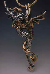 | Dragon Desire Pendant Two Piece Pendant - In this two part pendant the dragons entwine in their courtship dance. These dragons are pictured here with one dragon cast in 14K gold and it's mate cast in sterling silver. The combination of metals makes a beautiful contrasting piece as they twist and turn on their chain. The pendant is 2" long, chain not included. This is a special order item and will be made after being ordered. Therefore there will be a delay in the delivery of this item. |