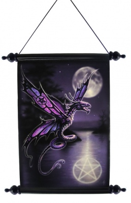 | NOW0909 - Dragon Fly Scroll - A purple dragon flies in the moonlight, the moon reflected on the water as a pentacle. Artwork by Anne Stokes |