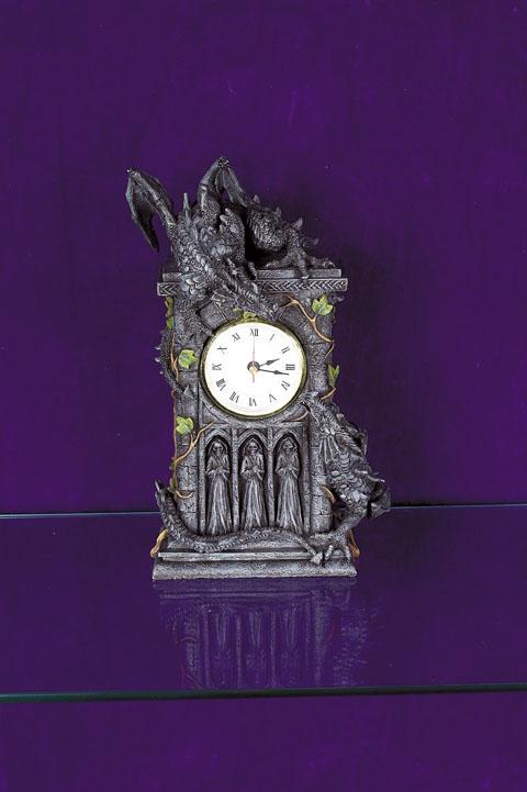 | Dueling Dragons Clock - A wonderful free-standing alternative to those carriage clocks all our grandparents seem to have (no, I don't know why. It is a universal mystery....). This darkly gothic clock has the grim reaper motif on the front at the bottom as a series of statues as if on the wall of a great palace of old. The pillars go upwards and the whole is covered in ivy and cracks as though this is a wall of very old age. Set in to the top half is a quality clock and around the whole clock a pair of dragons fight over who will claim the treasure within. A beautiful mantelpiece object to bring a bit more gothic decadence to your home. |
