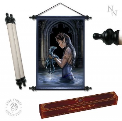 | NOW0854 -Water Dragon Scroll - A fay stands in her pool, examining the little dragon she has just been bathing. Artwork by Anne Stokes