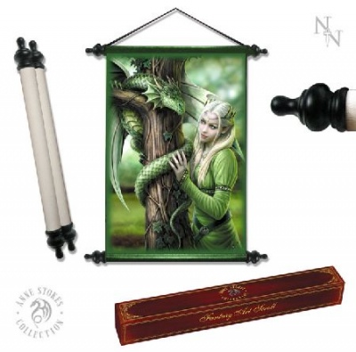 | NOW0888 - Kindred Spirits Scroll - A small green dragon curls around a tree with an elven lady looking on. Artwork by Anne Stokes |
