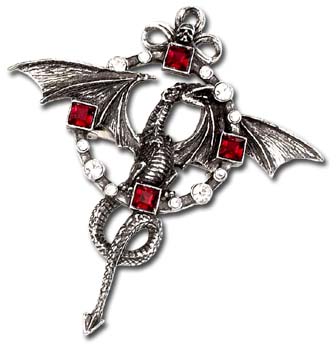 | Draco Mundus - The 'World Dragon' envelops the earth's ring with it's outstretched wings. The earths circle is a circle of clear gems with a square red gem at each of the 4 quarters. The dragon is perched on the ring with his tail below and wings outstretched. The gems are high quality crystal glass and the pin itself is pewter. Not overly large while ti can work as a cloak pin we always recommend a proper cloak pin for that (listed below). |