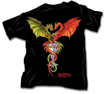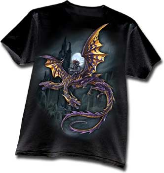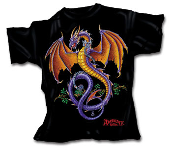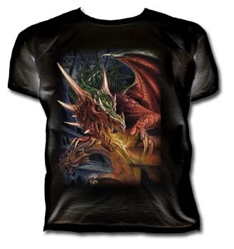 | Descent of the Dyad - Moments before the chaos... This T-shirt pictures a double-headed flying dragon ridden by a fiend ready to strike! |