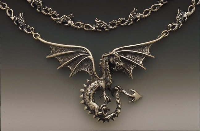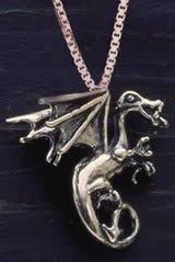 | Spreadwinged Dragon - here he is pictured with the dragon chain making this an expensive but stunning piece - Size of the pendant: 2 1/2" x 4" This is priced with a heavy figaro chain attached but is available without any chain for £247/$395 and as shown with dragon infinity links for £15/$24 per link (each link approximately 1" long - min. 16 links) |