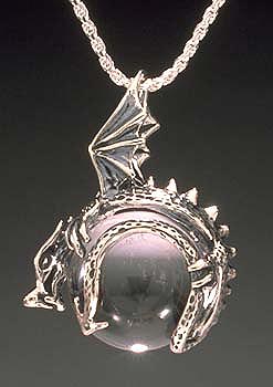 | Dragon Orb Pendant - Pictured with clear quartz crystal, but also available with rose quartz or onyx. I love this guy and have one myself. He is curled so perfectly with his wings forming the loop do that the whole piece is the dragon with no extra findings. Includes 24" chain. Size: 1 1/2" x 1 1/4" |