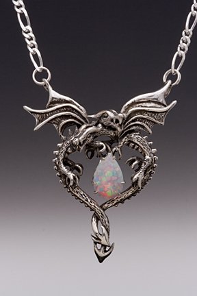 | Dragon Heart Necklace - These two dragons, entwined to form a heart, grip a gemstone in their claws. Figero chain comes attached and dragons are detailed on both sides. Size: 1 3/4" W x 2" H The sterling silver pendant is supplied with either a Gilson Opal (as pictured) or a 9mm trillion Garnet (like the amethyst one below). Includes chain at 18" however we can get it longer or smaller as required for an additional charge. |