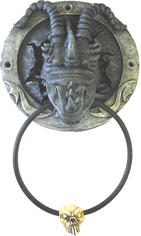 | Dragon Door Knocker - With a skull on the end of the ring, the dragon's head comes out through your door and grasps firmly in its mouth a knocker ring. It looks like the tribal pattern is smoke to flames from its nostrils! Fun and whimsical, a great item for a dragon fan! |